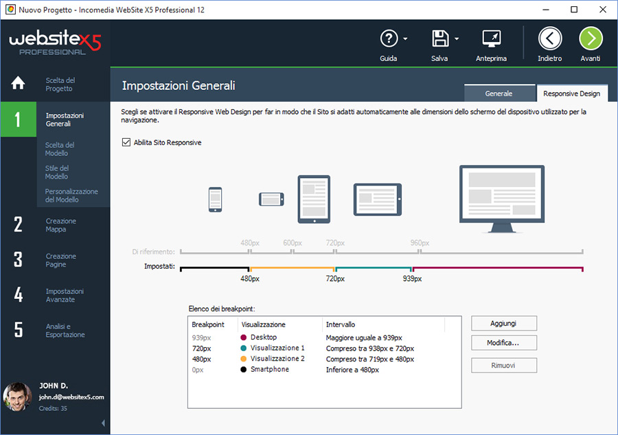 usufruire di strumenti professionali come form email per l’area customer, l’area riservata, integrazione con il database, e-commerce, senza escludere la possibilità di poter inserire codici html/css/js personalizzati. Ma la caratteristica e funzionalità principale di questa nuova versione di WebSite X5 Professional è che restituisce siti web sempre rigorosamente responsive e completi di app.